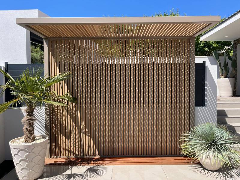 Le cadre en acier thermolaqué garantit une excellente résistance aux intempéries, tandis que les lames en bois composite assurent une longévité sans entretien. Ce type de réalisation convient parfaitement aux projets de brise-vue, pergola ou pare-soleil contemporain dans la région de Ventabren et ses alentours.