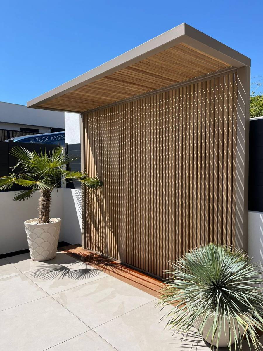 Réalisée à Ventabren, cette structure sur mesure signée L’Atelier du Ferronnier associe élégance contemporaine et technicité artisanale. Le projet met en valeur un brise-vue métallique à lames verticales bois intégré dans une structure en acier thermolaqué. Une conception pensée pour allier protection solaire, intimité et esthétisme haut de gamme.