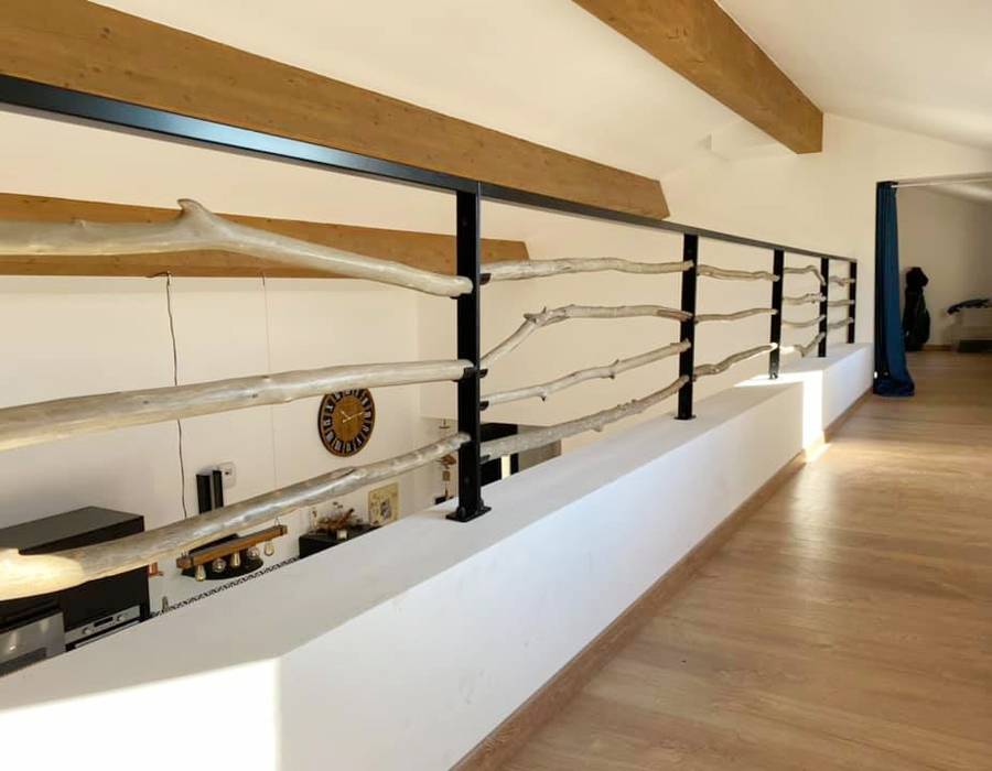 Nous avons conçu et réalisé ce garde-corps intérieur de style moderne et naturel, avec l'ajout d'éléments en bois flotté, une tendance actuelle.
