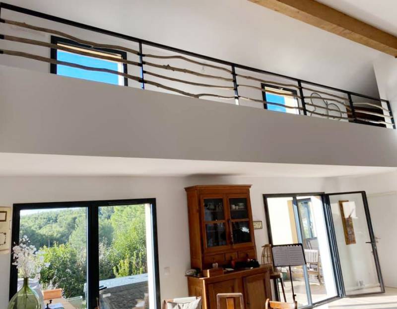Fabrication sur mesure de garde-corps thermolaqués en noir mat. Fixation du bois flotté.