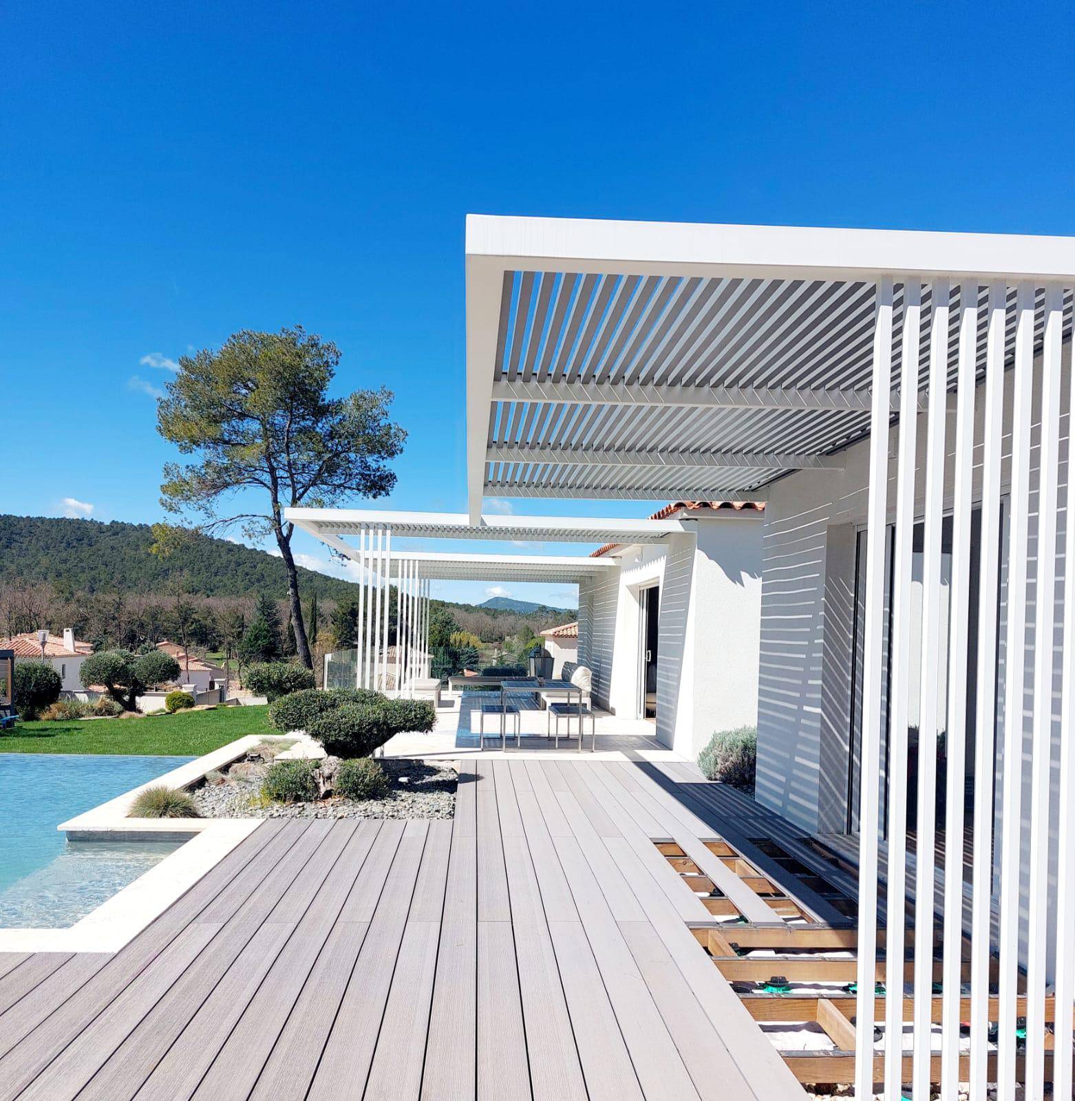 Notre client, propriétaire d'une magnifique villa avec piscine à Éguilles, souhaitait une structure à la fois design et fonctionnelle pour ombrager ses terrasses et valoriser les lignes contemporaines de son habitation. Nous avons conçu et fabriqué une pergola en acier blanc à lames fixes verticales et horizontales, parfaitement intégrée à l’architecture de la maison et à son environnement verdoyant.