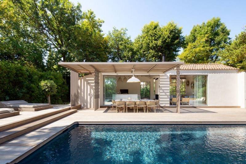 Chaque pergola est imaginée et fabriquée selon les besoins de nos clients : taille, proportions, couleurs, type de couverture et finitions sont entièrement personnalisables. Ici, la pergola vient prolonger la terrasse en bois et créer un espace repas extérieur ombragé, idéal pour profiter du climat méditerranéen.