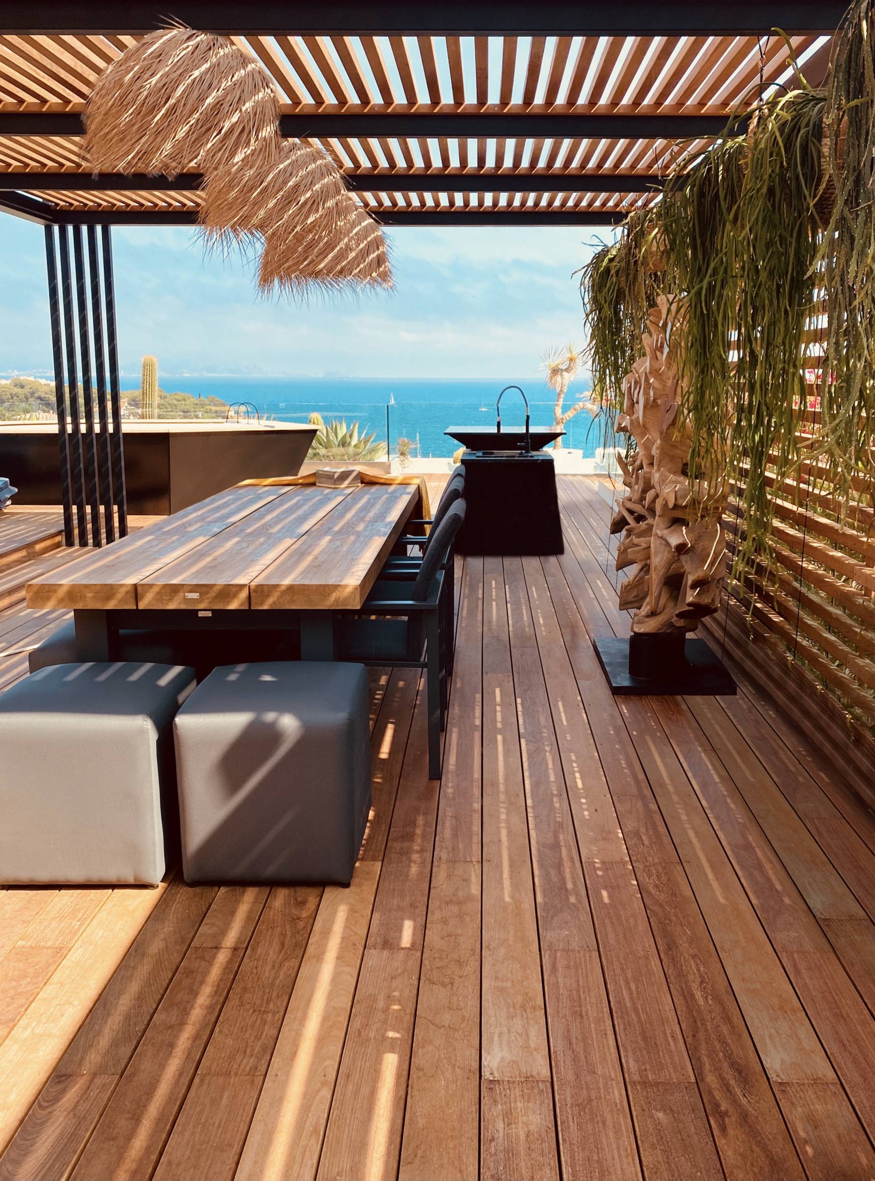 TECK AMENAGEMENT à réalisé l’habillage de la pergola en carrelets en bois exotique. Les dimensions et les espacements des bois sont choisi en fonction de l’ombre souhaité par le client et de l’exposition de sa terrasse.