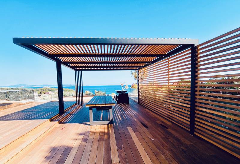La création d'une pergola bioclimatique en acier et bois exotique à carry le rouet proche de Marseille.